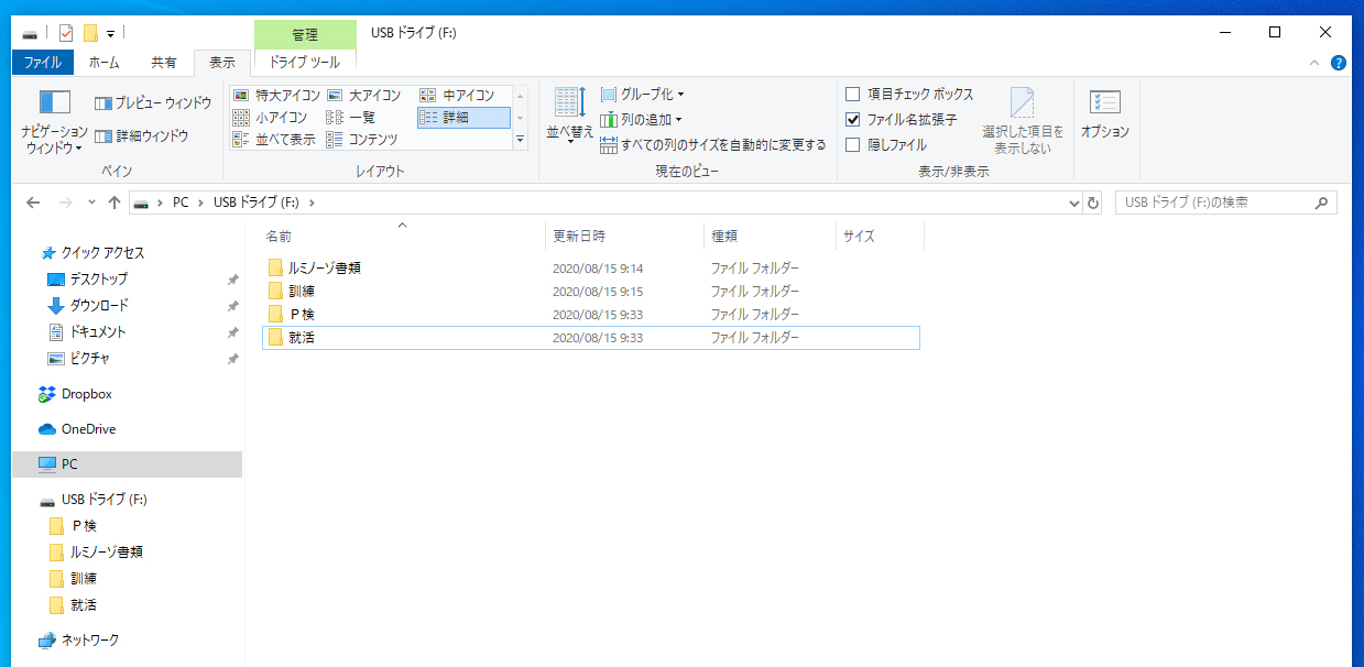 新しくフォルダを作るには、まずフォルダを作成する場所を指定し(今回はUSB)右クリック→新規作成→フォルダを選択。フォルダに適切な名前をつけて作成します。