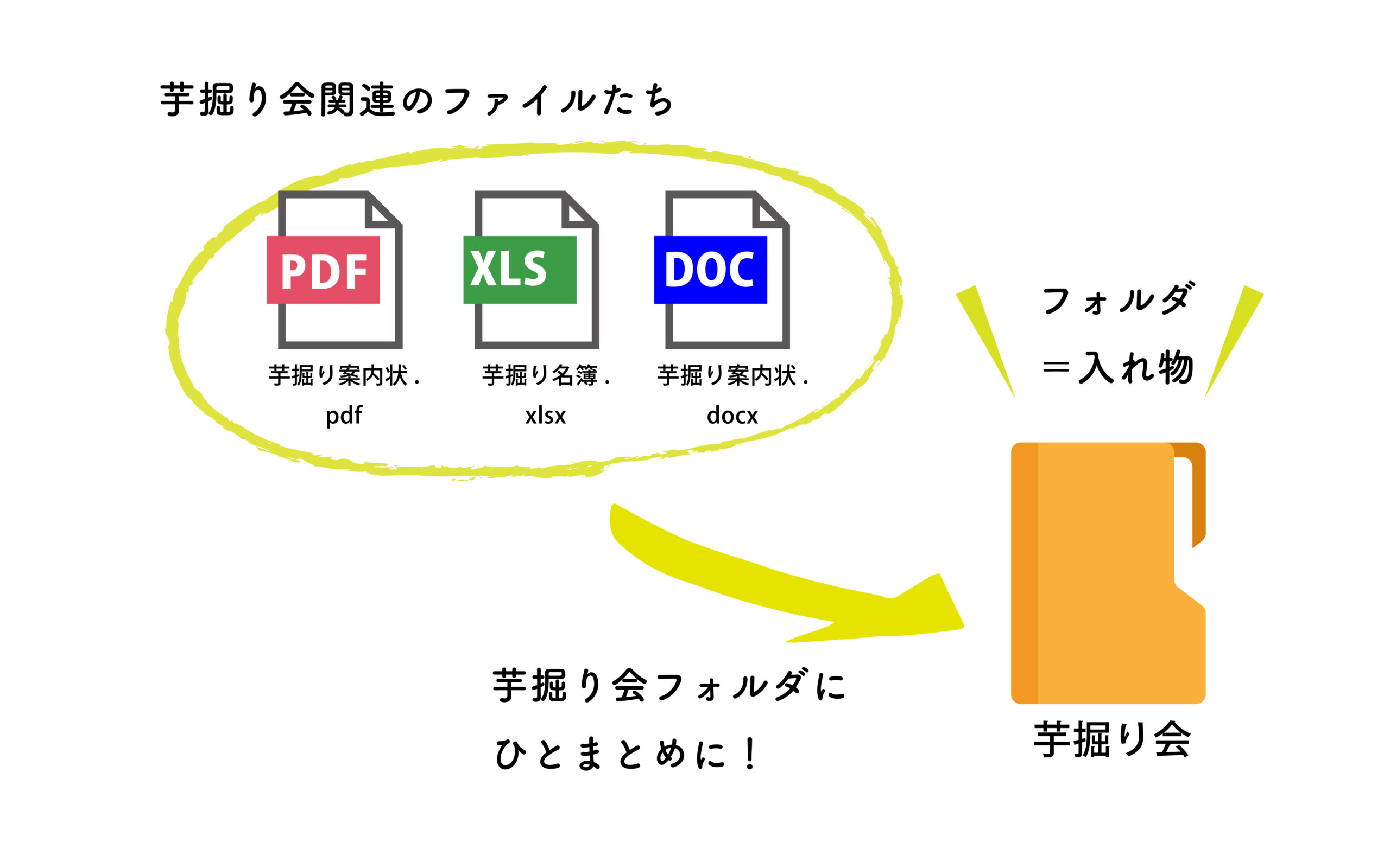 スマホで撮影した写真や、訓練で作ったWord文書、イベントの予算書など、拡張子は別々でも、あるテーマに沿って関連するファイルを入れておくのがフォルダです。