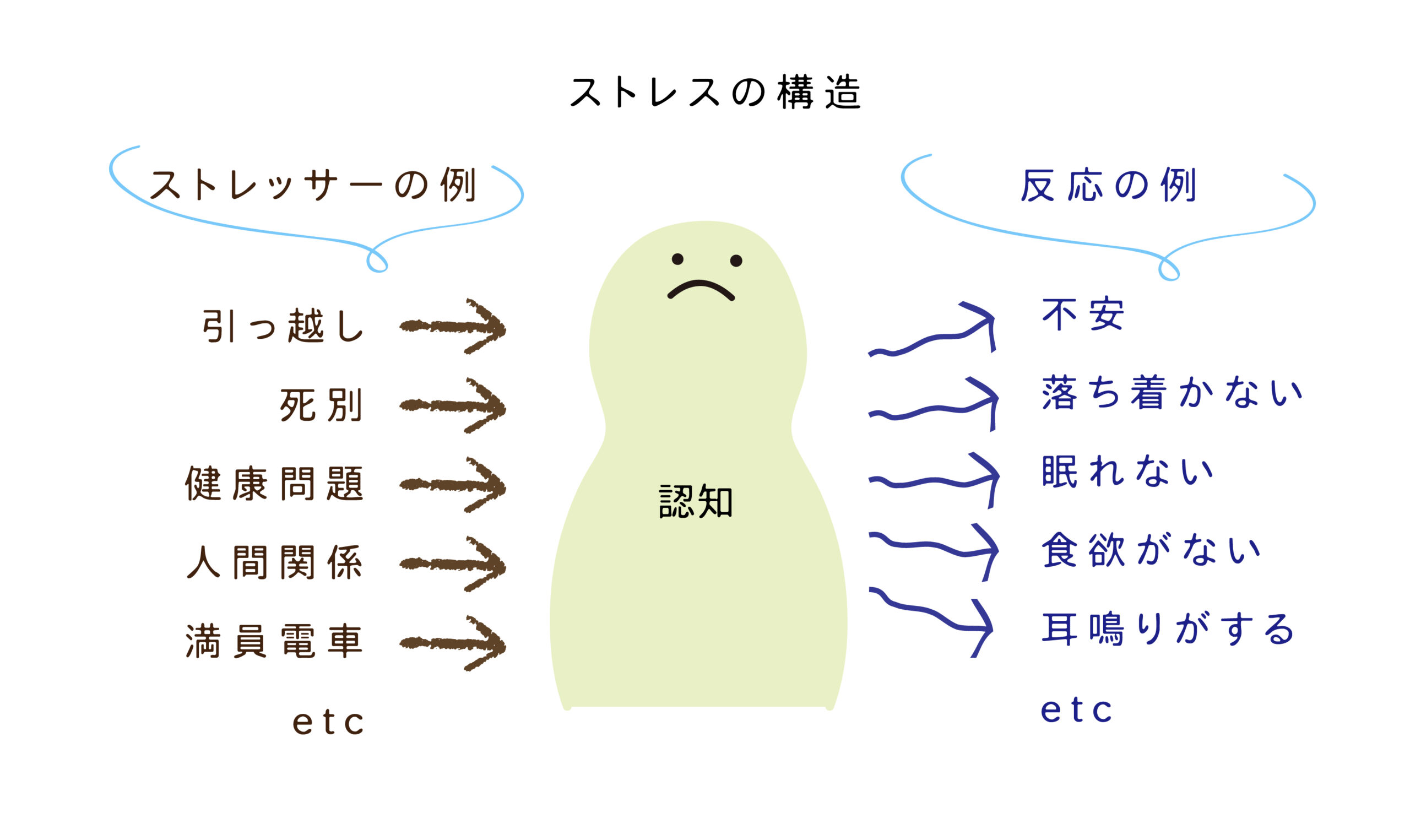 人はストレッサー(ストレスとなる原因)に直面したとき、自分の能力や、これまでの経験、価値観などを元に、「このストレスに対応できるか」判断し、行動します。「対応できない」「こわい」「不安」などネガティブに処理した状態、これがストレスです。